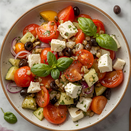 - Mezclar todo: En un bol grande, agrega los tomates, el pepino, el pimiento rojo y la cebolla morada. Si decides usar queso feta, córtalo en cubos y agrégalo a la ensalada.